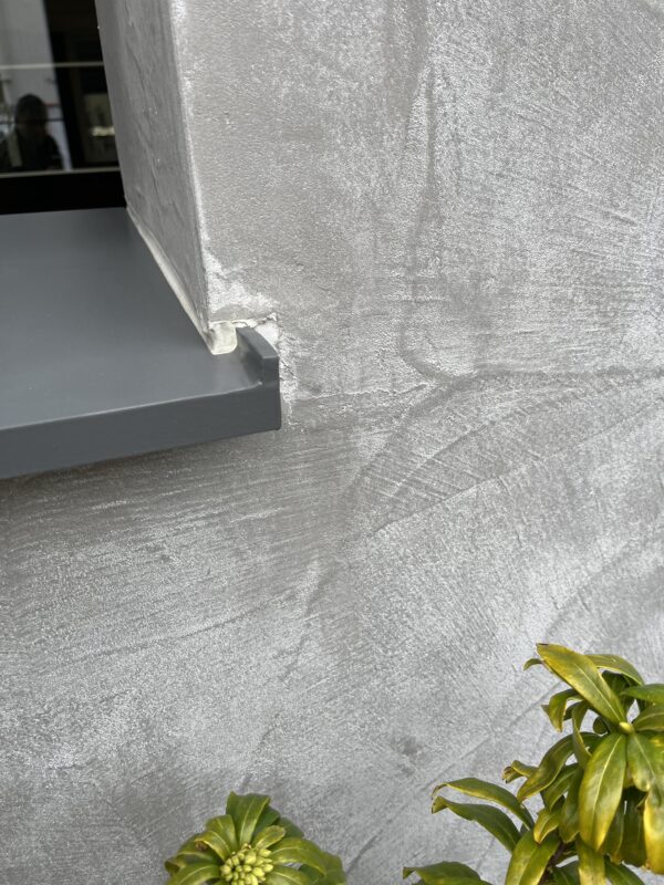 あとこの窓の水切りですが、凄く前にゼネコンの監理担当のベテランの方(今だと80歳くらい?)に教えてもらった納まりと同じです。端部を上げる形になっていて、横からの雨垂れが無くなり壁面が汚れない納まりです。私も教えてもらってから色々と試してみましたが、コストの関係で実現した事は有りません。実現しているのを見るのは初めてだと思います。